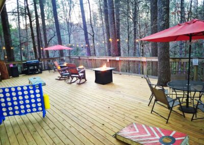 Our waterfall retreat offers Convenient day and night access to the large recreation deck (propane gas fire pit, tables with umbrellas, chairs, rocking chairs, and even a cornhole game). From this deck, step onto a wooded trail winding down to the riverside and waterfall. Lay directly in the falls, relax in the water, or simply enjoy the sounds and scenery!