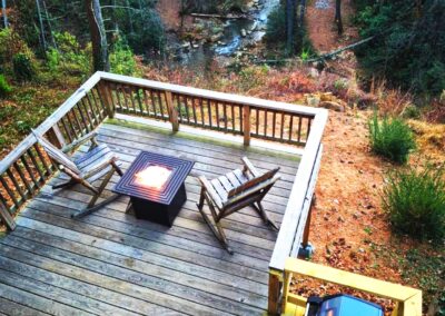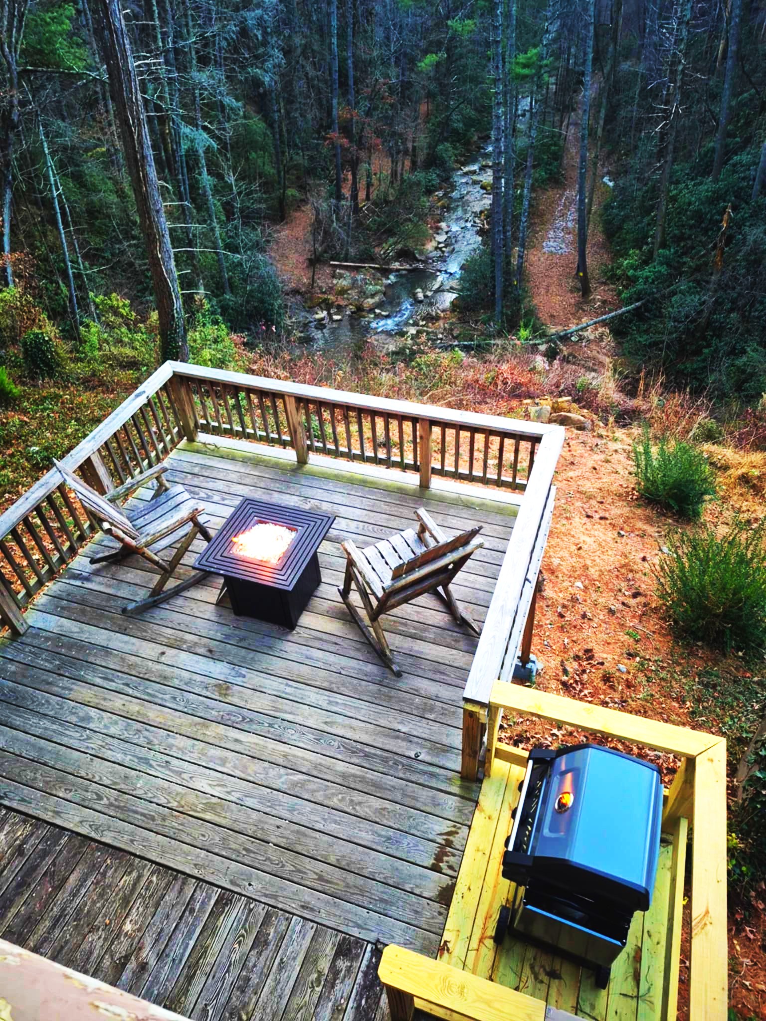 This Private Deck Suite has a private 12 x 12 deck located directly above the waterfall! It has a beautiful view of Tiger Creek. The private deck has a propane firepit as well as a grill.